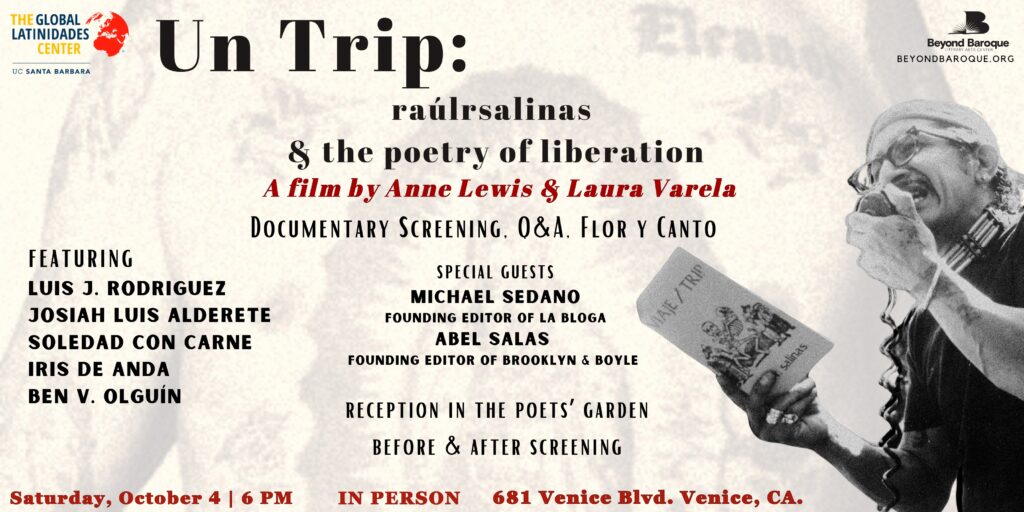 Join us at Beyond Baroque for a night honoring the legacy of the beloved Chicano poet raúlrsalinas, whose words and activism continue to resonate across generations. In partnership with The Global Latinidades Center, this free and public program brings together film, poetry, and conversation to celebrate Raúlrsalinas’ profound contributions to art, liberation, and community. Before and after the screenings, guests are invited to a reception in the Poets’ Garden.